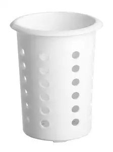 Biały kubek na sztućce, wykonany z wysokiej jakości tworzywa sztucznego, wyróżnia się bardzo małą wagą i dobrym stosunkiem jakości do ceny.