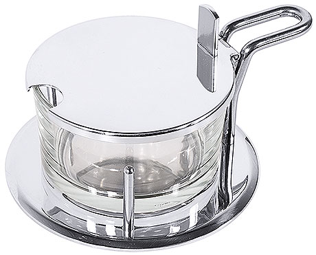 Dyspenser do parmezanu składający się z ramy wykonanej z polerowanej stali nierdzewnej i wkładu z grubego szkła. Pokrywka z wycięciem na łyżeczkę.