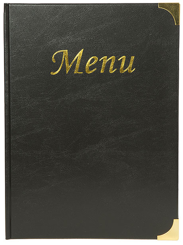 Łatwa w czyszczeniu karta ze złotym napisem „Menu” w formacie A4 z trwałego materiału skóropodobnego. Zawiera wkładkę plastikową. Maksymalnie na dziesięć kartek A4 (2 miejsca wewnątrz okładki i 4 dwustronne wkładki).