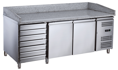 2-drzwiowy stół chłodniczy do pizzy Technica to niezastąpione urządzenie dla każdej pizzerii i lokalu gastronomicznego. Dzięki dużej pojemności 580 l i dwóm komorom oferuje optymalne warunki do przechowywania składników. Wykonany z wysokiej jakości stali nierdzewnej, gwarantuje wyjątkową trwałość, łatwość w utrzymaniu higieny i odporność na korozję. Dodatkowo solidny blat granitowy o wymiarach 2025x800 mm jest idealny do przygotowywania ciasta, a 7 niechłodzonych szuflad pozwala na wygodne przechowywanie akcesoriów.