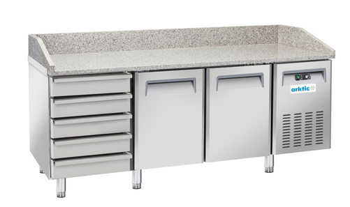 Stół chłodniczy do pizzy 2-drzwiowy z 5 szufladami to wygodne miejsce do przyrządzania pizzy oraz innych potraw. Świetnie sprawdzi się nie tylko w pizzeriach, ale również w innych lokalach, w których serwowana jest pizza. Wysokiej jakości stal nierdzewna i granitowy blat są higieniczne i łatwo jest je utrzymać w czystości.