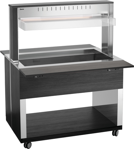 Mobilne rozwiązanie bufetowe o nowoczesnym designie drewna – wózek bufetowy z osłoną higieniczną i oświetleniem LED jest w stanie pomieścić 3 pojemniki 1/1 GN, a dzięki wykorzystaniu zasady kąpieli wodnej potrawy w bufecie pozostaną ciepłe i kuszące dla oka.